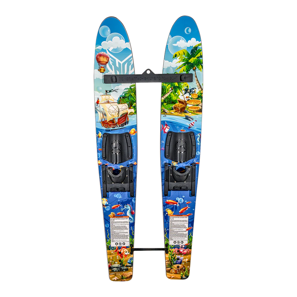 The Hot Shot Trainers are THE perfect skis for our aspiring waterski pro! With a package that includes a trainer bar and tail connection, your junior skier will have the most stable platform for learning to ski. In addition, the Hot Shot Trainers include a parent hand held rope system allowing the parent in the boat to control their little skier’s ride. Adjustable horseshoe bindings fit a wide range of kid’s feet sizes and bright graphics keep little skiers visible in the water. The perfect toy to teach the future generation of water sport enthusiasts.